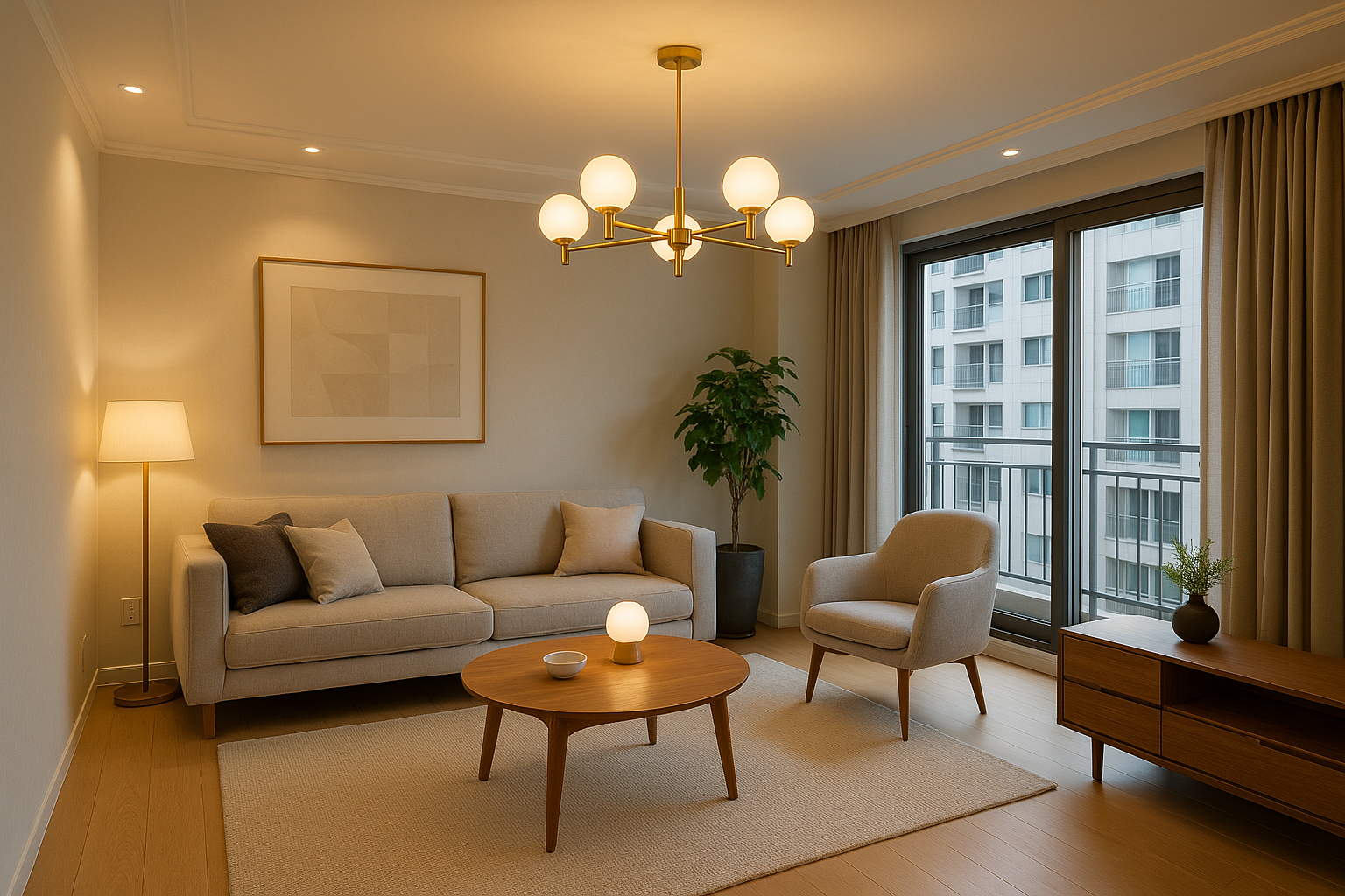- 거실: 2700K 따뜻한 색온도 간접등 + 3000~4000K 메인 다운라이트 조합
