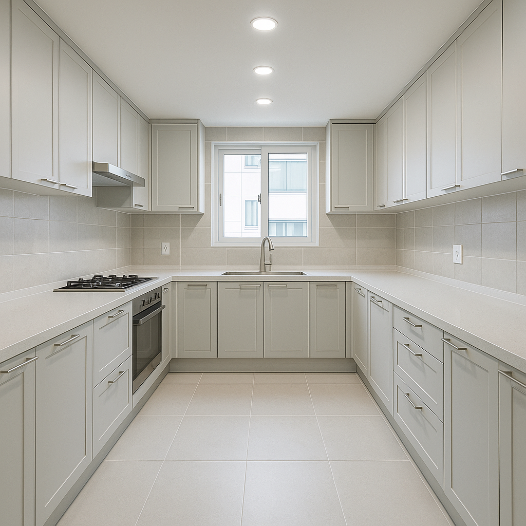 - 장점: 벽면 활용 극대화, 냉장고·싱크·조리대 동선 효율적